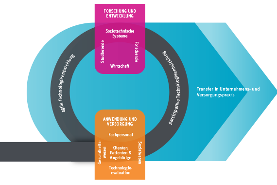 Wir setzen auf eine anwenderorientierte, partizipative Forschung und etablieren zu diesem Zweck gemeinsam mit unseren Partner*innen Strukturen, die Praxisorientierung ermöglichen. Zu diesen Strukturen zählen beispielsweise CareTech Hubs, Reallabore, eine gemeinsame Care-Dateninfrastruktur und feste Probanden-Panels. Rund 30 Professorinnen und Professoren aus den Bereichen Gesundheit, Sozialwesen, Ingenieurwissenschaften, Mathematik, Informatik, Wirtschaft und Recht bringen ihre Erfahrungen in die Grundlagen- und Anwendungsforschung ein. Zudem qualifizieren wir hochkarätigen Nachwuchs, etwa in Tandemformaten zusammen mit Praxispartner*innen und bilden Studierende von Anfang an praxisorientiert aus.