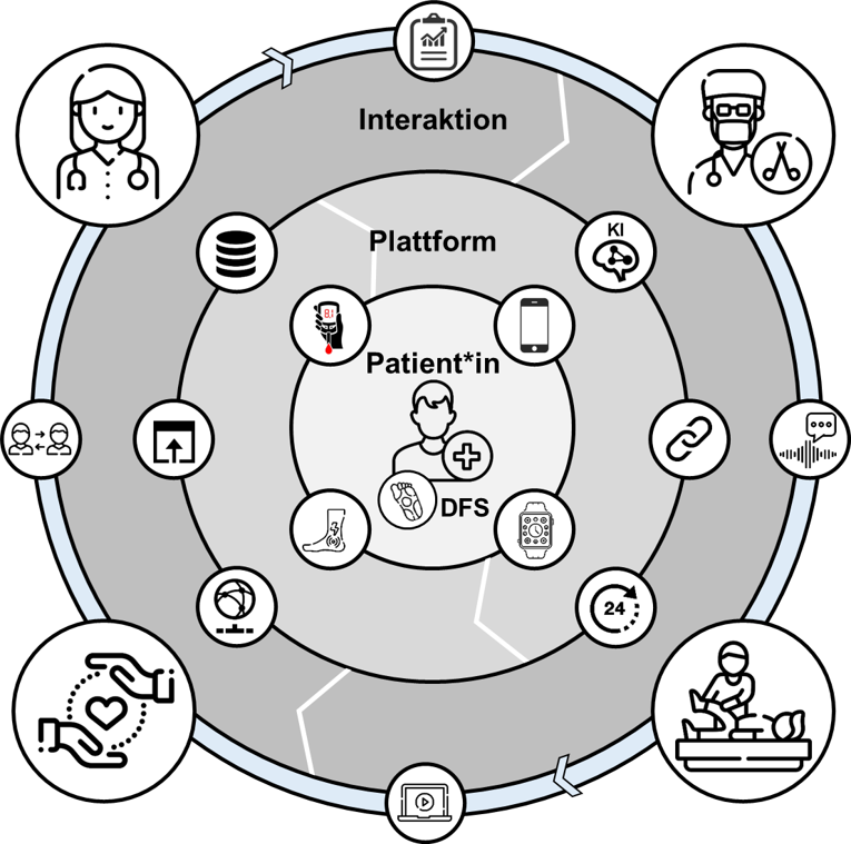 Durch Einsatz von Smart Devices (Smartwatch, Smartphone, Fuß-Sensorik) und Sprachassistenz inkl. Anbindung an eine Datendrehscheibe soll eine bessere Überwachung von Patient*innen und Vernetzung mit medizinischen Dienstleister*innen gewährleistet werden. Hauptziel ist die Patient*innen durch den Demonstrator in die Lage zu versetzen, ihre eigene Gesundheit und ihre Diabetes mellitus Erkrankung selbst zu kontrollieren und zu organisieren. Dadurch sollen sowohl die Gesundheit als auch die allgemeine Lebensqualität erhalten oder verbessert werden.
